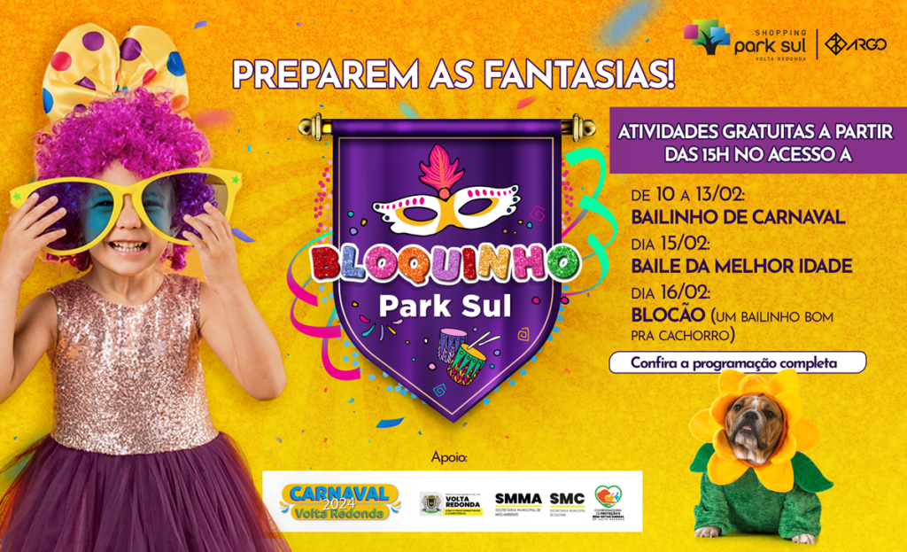 As crianças terão 4 dias de folia, de sábado a terça-feira, com atividades como pintura de rosto, mini trio elétrico e guerra de confetes. Na quinta-feira (15) é a vez do Baile da Melhor Idade, em parceria com a Secretaria Municipal de Cultura, que vai provar que não existe limite para a folia. A sexta-feira está reservada para o BloCão, um bloquinho bom pra cachorro, que promete explodir o fofurômetro de todos que gostam de pets, evento em parceria com a Secretaria Municipal de Meio Ambiente. Todas as atividades são gratuitas e terão início sempre às 15h no Acesso A do Shopping Park Sul.