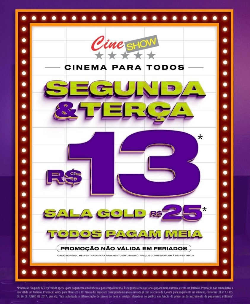 A primeira delas acontece todas as segundas e terças-feiras, quando os ingressos custam R$ 13 para sessões em 2D e R$ 25 para a sala Gold, que possui estrutura diferenciada, com assentos reclináveis eletronicamente e ambiente VIP.
